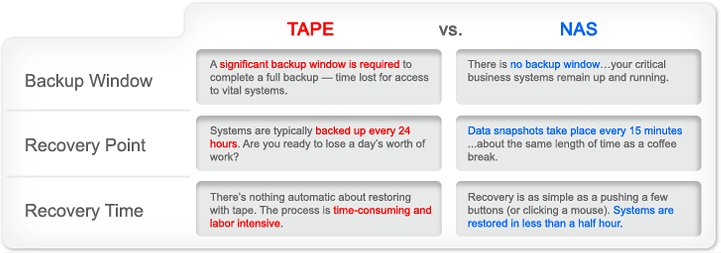Though tape backup is common, it’s far from being an ideal BDR solution. Analysts have said that over half of tape backups fail, so chances are that if you need to restore from tape, you’ll be out of luck. But assuming all goes well with tape backup, how does it compare with the NAS appliance?